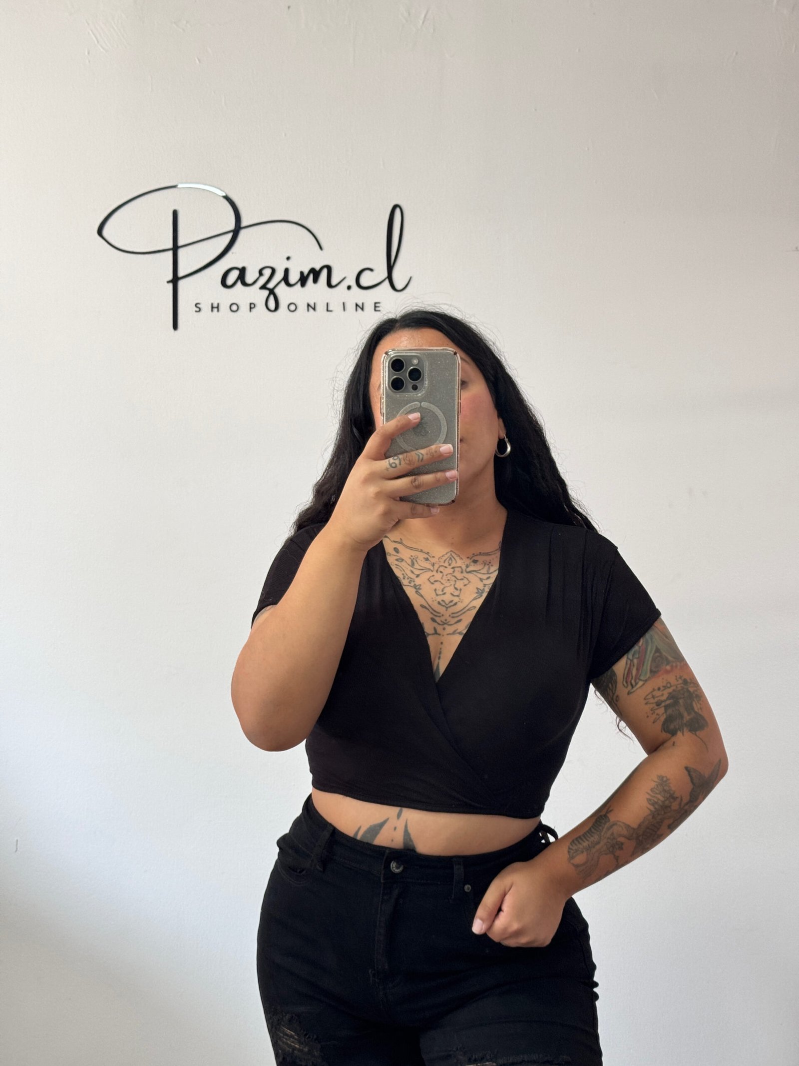 Hermoso crop top negro con escote en V, full elasticado y de calce favorecedor. Ideal para la temporada de verano y para combinar con cualquier outfit.