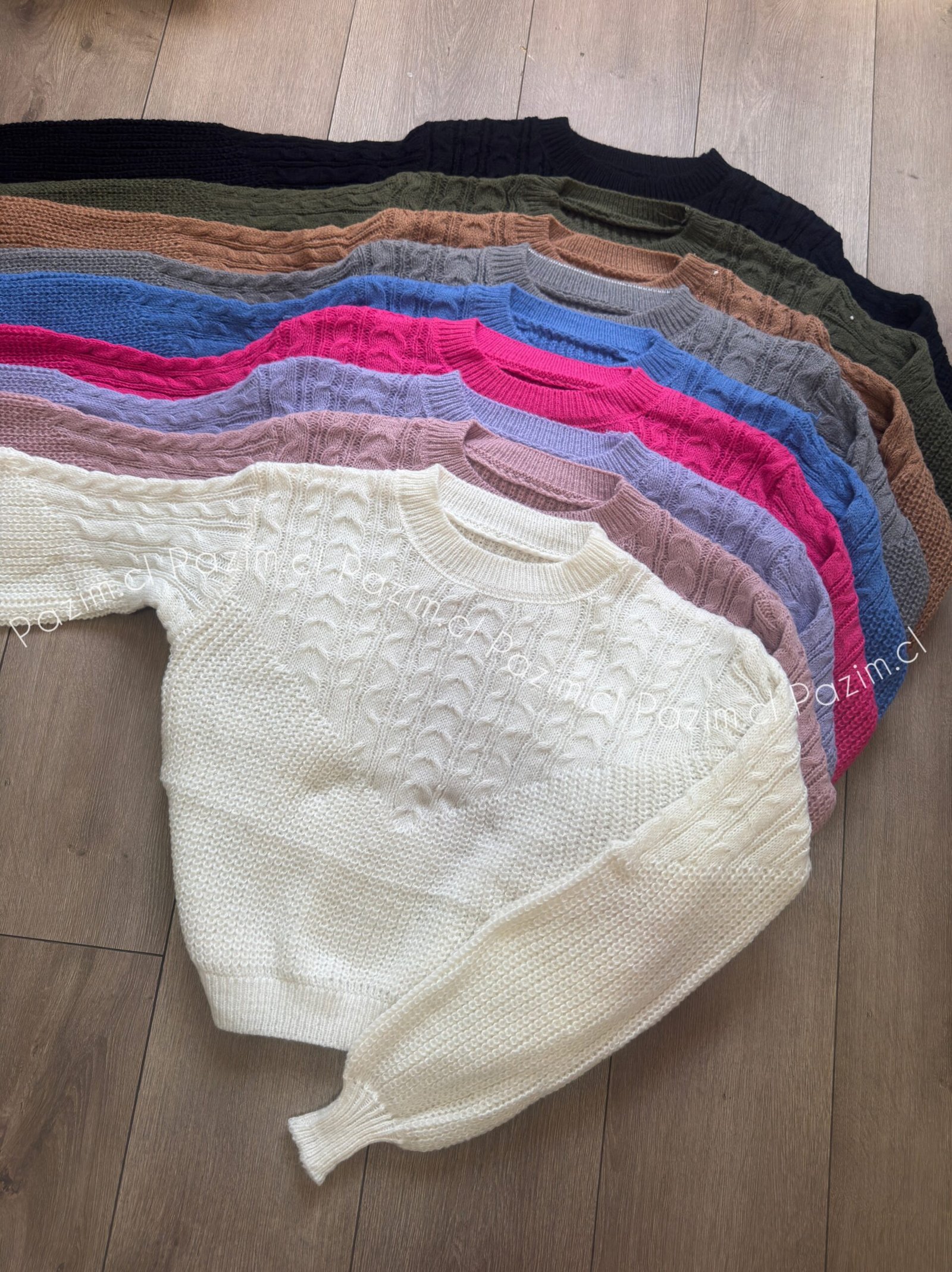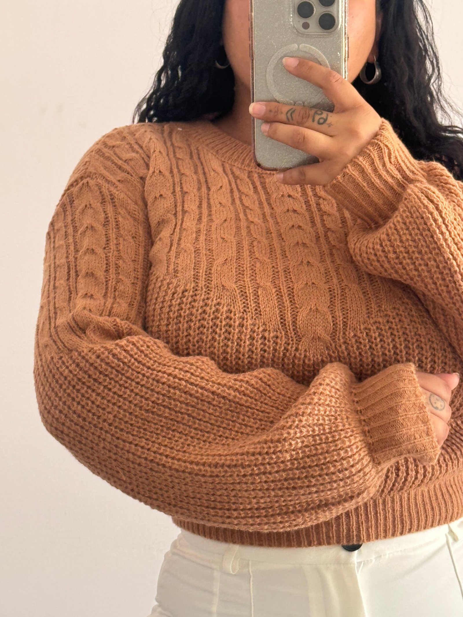 Hermoso sweater tejido con diseño trenzado y mangas englobadas que le dan un calce muy lindo y femenino. Su tejido es cómodo y se adapta bien al cuerpo.